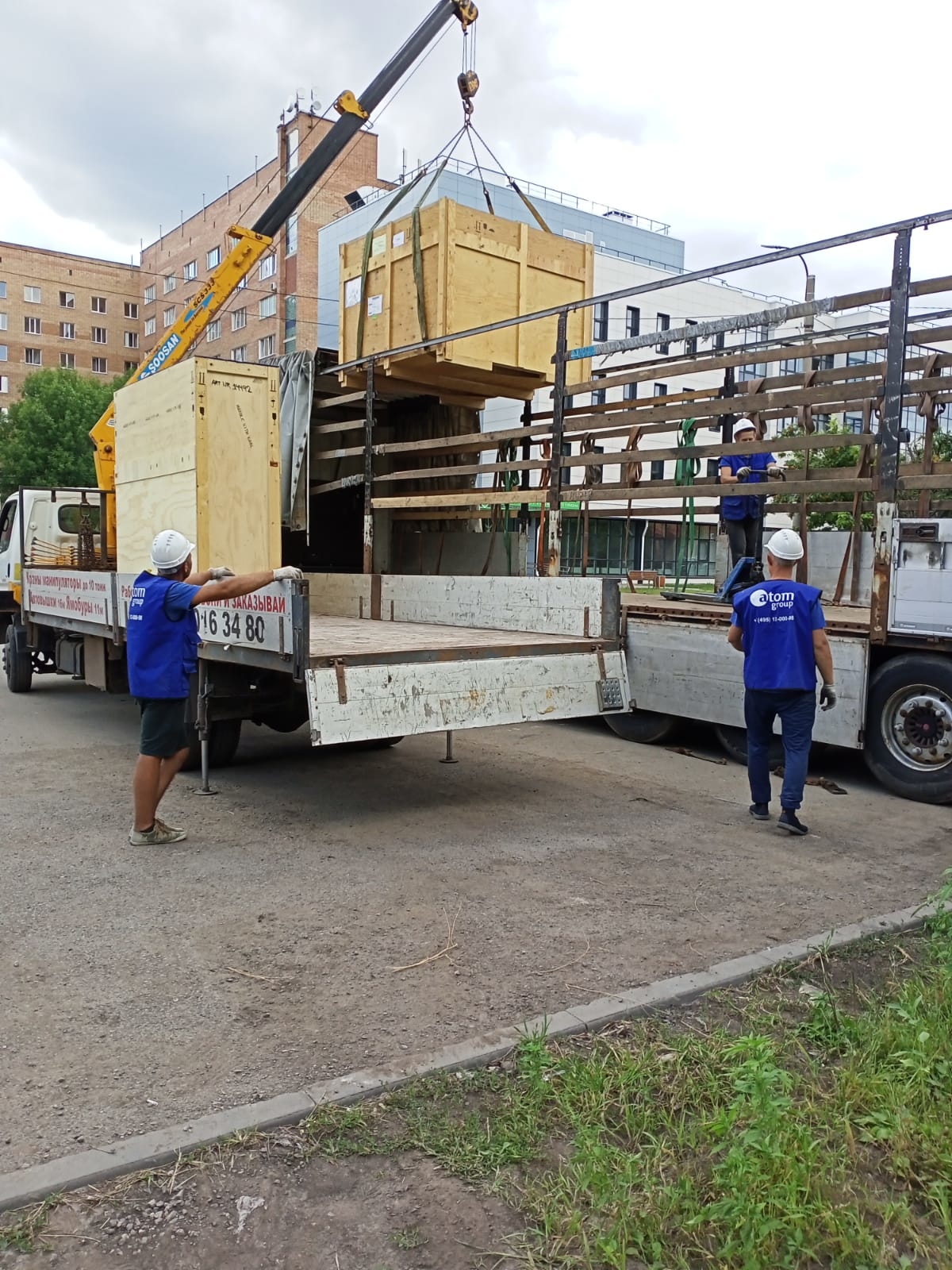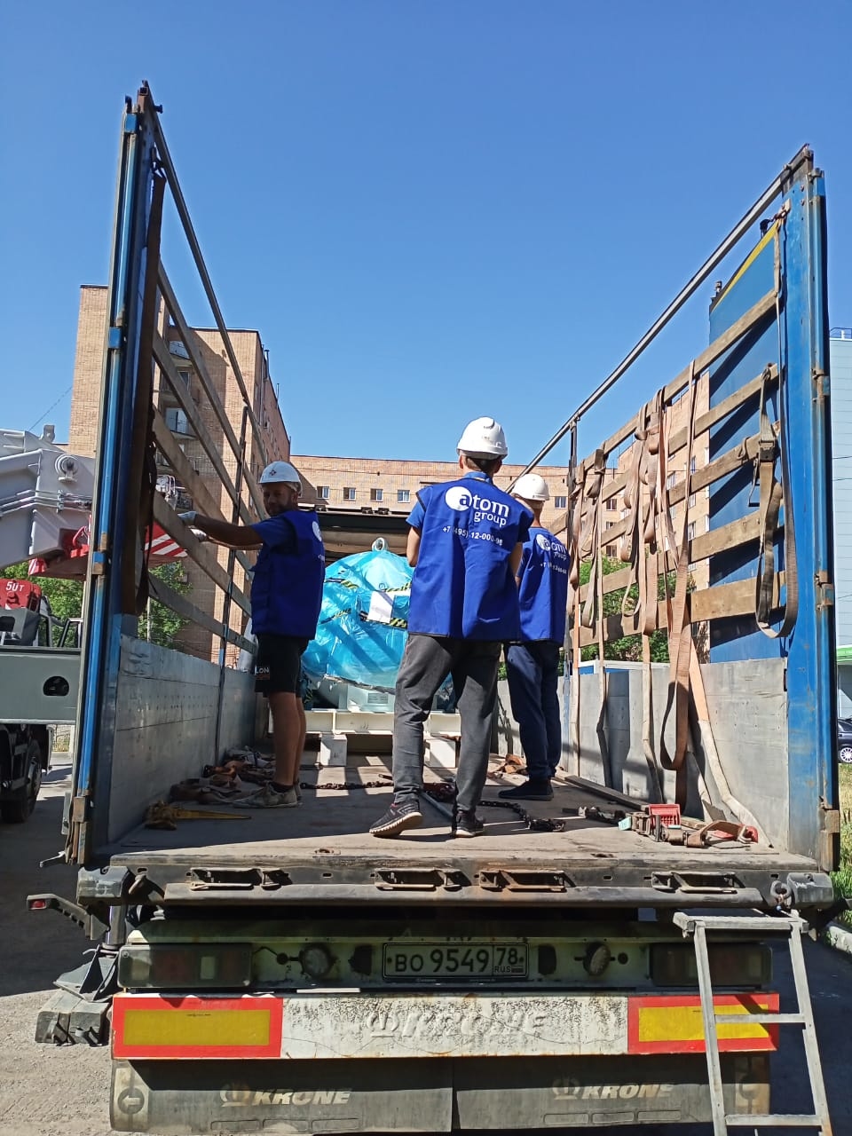 В работах задействована спецтехника (Автокран Челябинец плюс 50 тн на базе Камаза и манипулятор с открытой площадкой), такелажная бригада из 6 человек и такелажное оборудование (лебедки, домкраты, роликовые платформы)