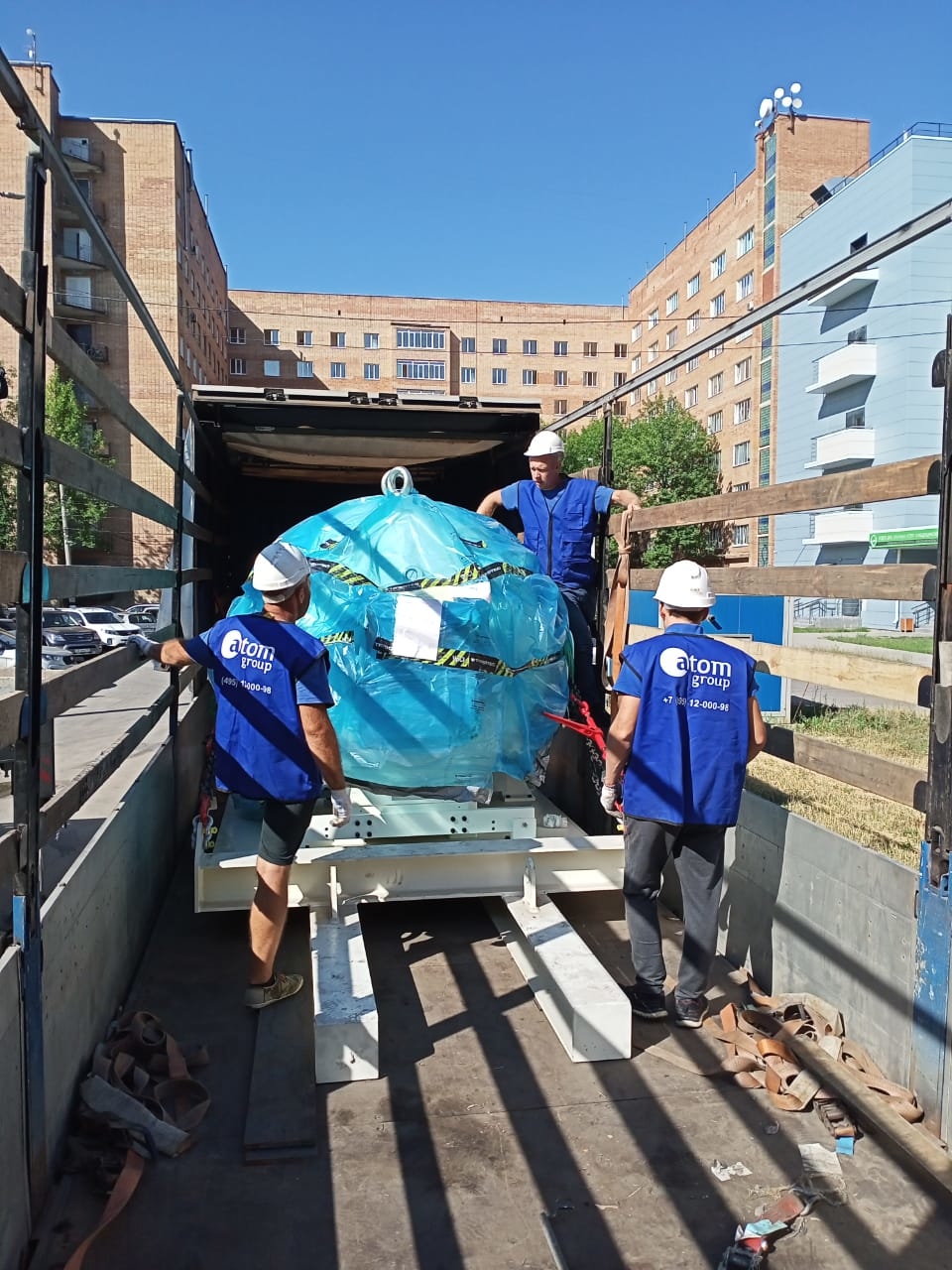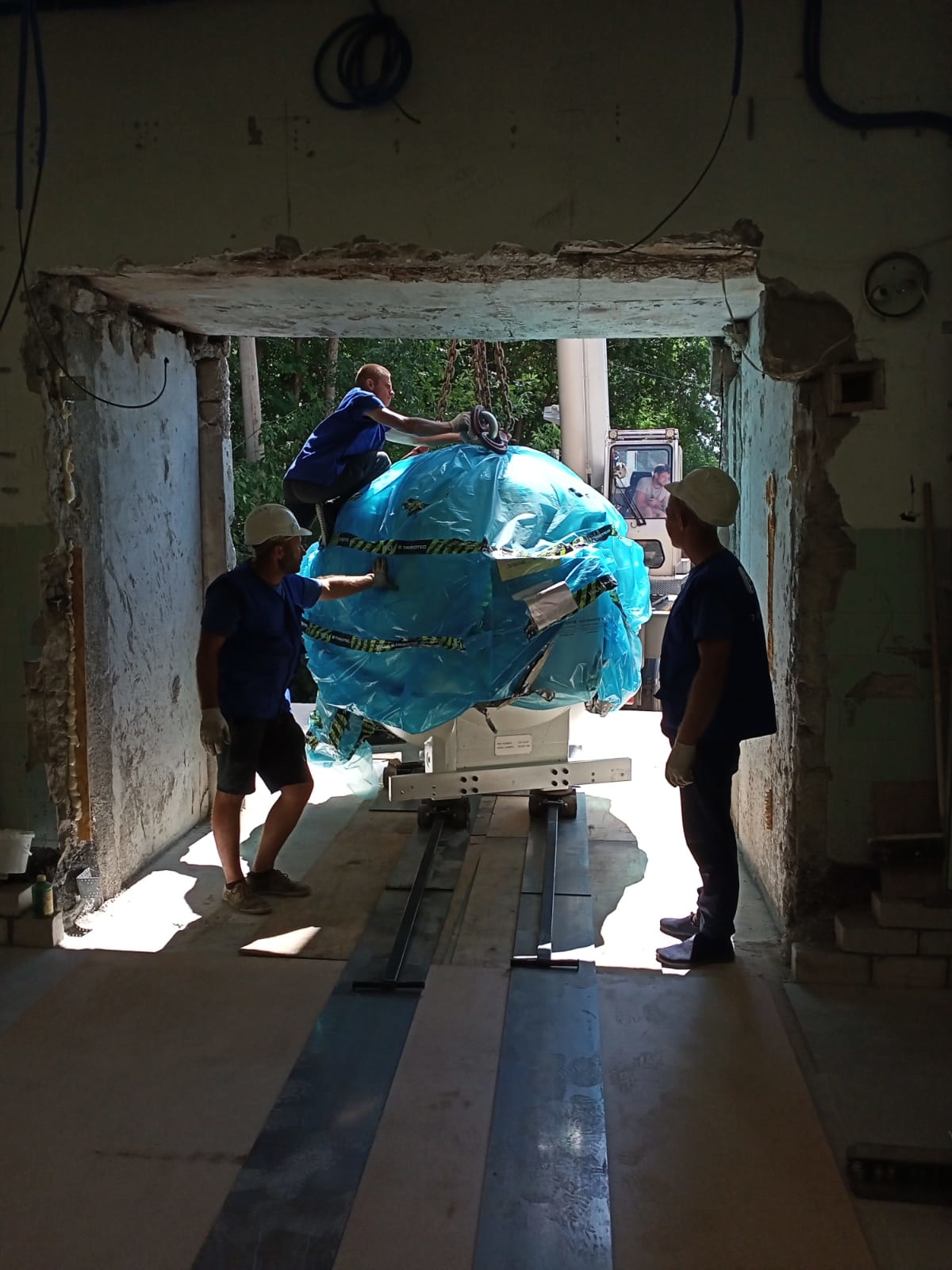 Трудность заключалось в том что на территории ЛПУ не было возможности подъезда большегрузного транспорта с оборудованием до места проведения такелажных работ. Было принято решение привлечь манипулятор грузоподъемностью 20 тонн, для дальнейшей транспортировки оборудования к месту разгрузки.