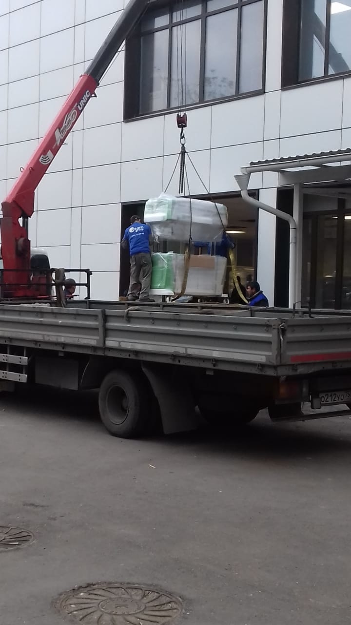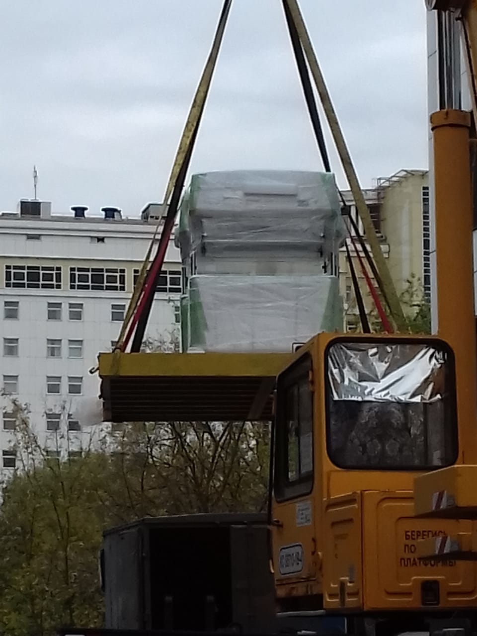 При помощи автокрана и сварной площадки, оборудование подавалось через оконный проем первого и третьего этажа.