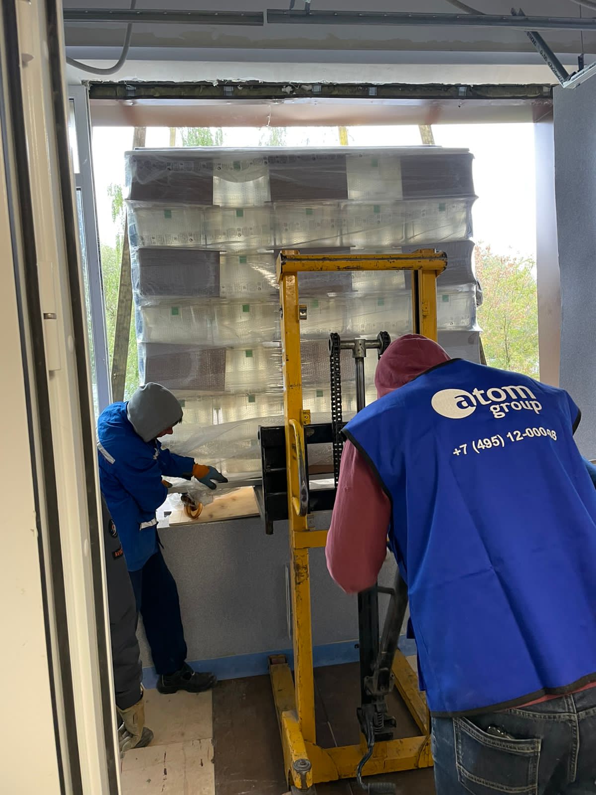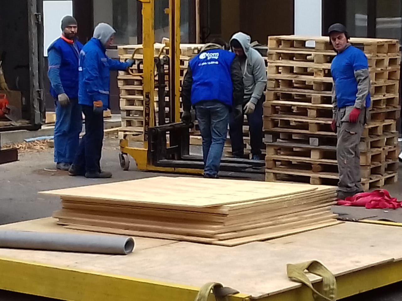 Закуплены стройматериалы (деревянные паллеты и фанера) для строительства площадки сооруженной для приема оборудования через оконный проем